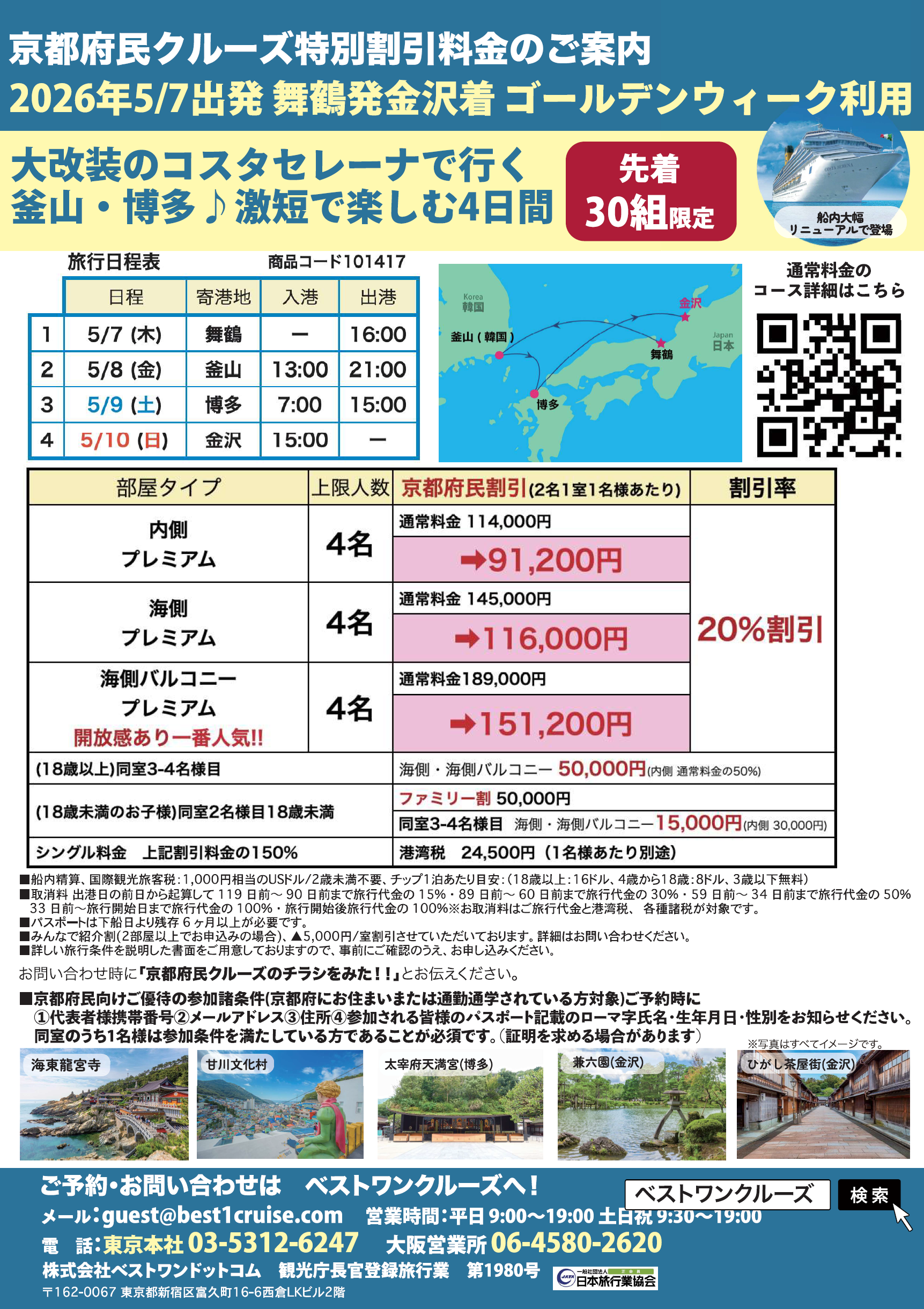 舞鶴からクルーズの旅、2026年5月・京都府民クルーズ特別割引 クルーズニュース 2025.11.14 京都舞鶴港から乗船できるコスタ・セレーナ(日本海周遊クルーズ)が、来年2026年5月に京都府民限定の特別価格により実施されます。この機会に、舞鶴からクルーズの旅に出かけてみませんか。 日 時: 2026年 5月 7日 16時 舞鶴出港~ 2026年 5月10日 15時 金沢入港 乗船場所:京都舞鶴港 西港第2ふ頭(舞鶴市字松陰) 定 員:先着30部屋 問合せ先: (株)ベストワンドットコム03ー5312ー6247